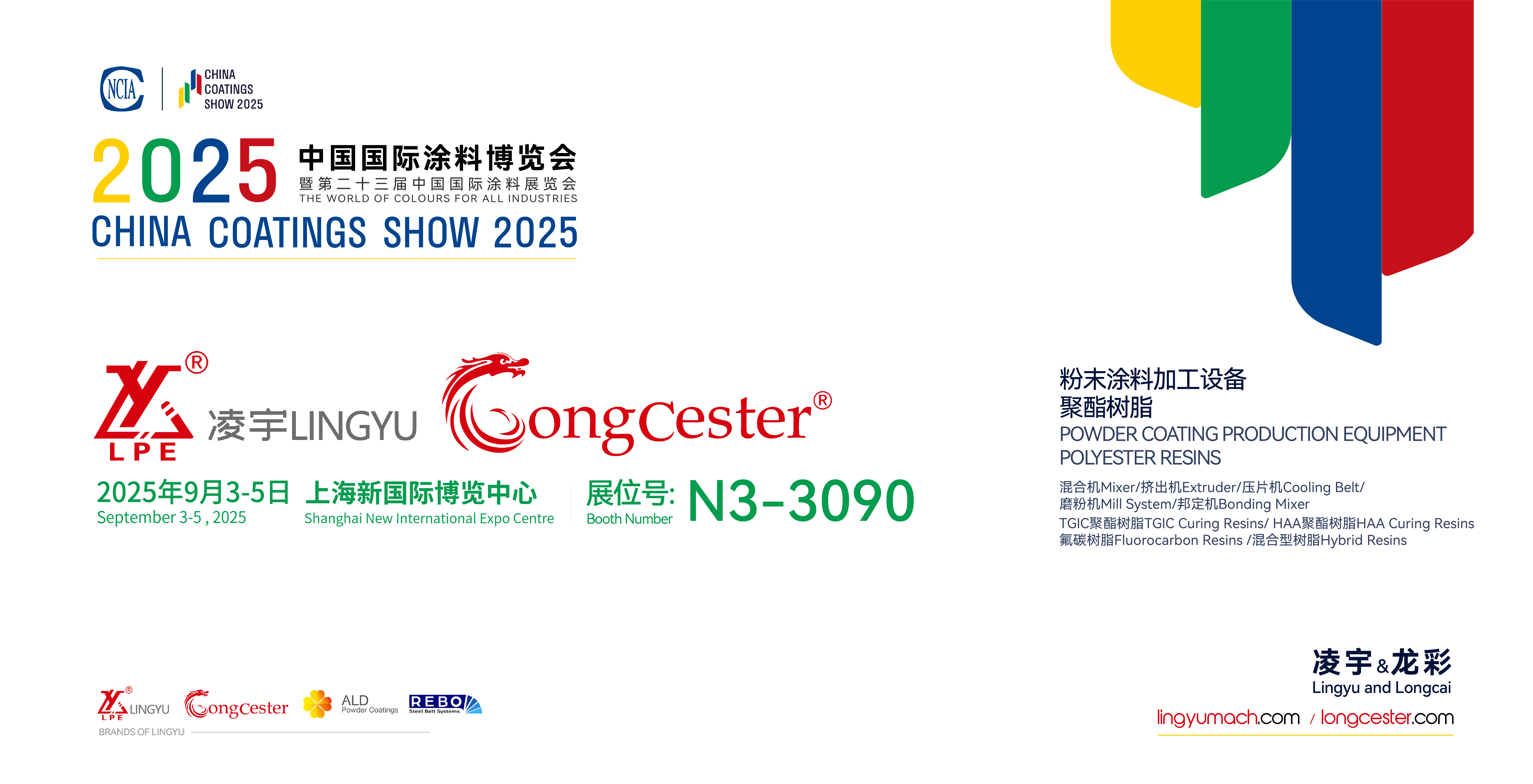 作為中國粉末涂料加工設(shè)備及原材料領(lǐng)域的代表性企業(yè),凌宇機(jī)械與龍彩新材料將亮相本屆展會,展位號N3-3090。