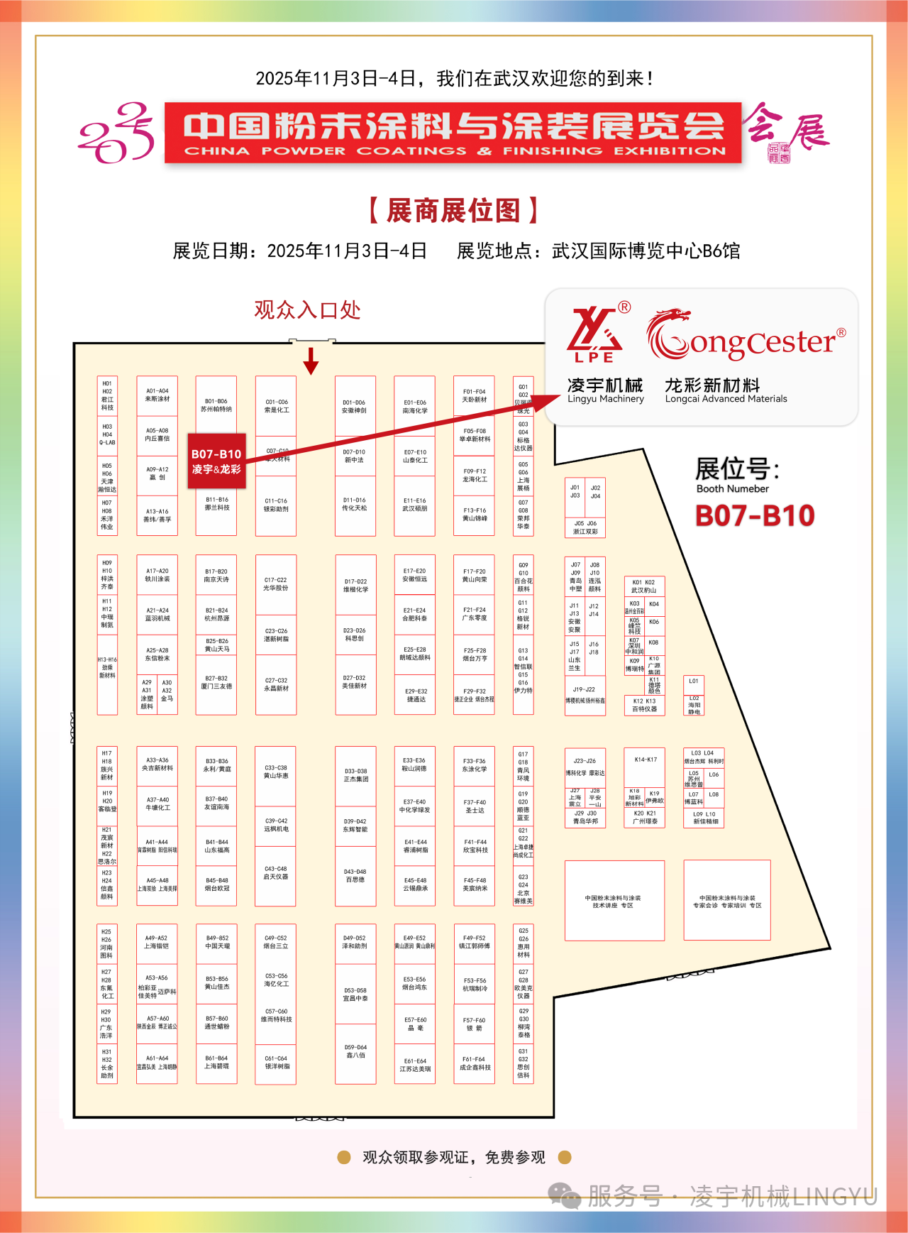 作為粉末涂料加工設備與原材料領域的代表性企業,凌宇機械與龍彩新材料將聯袂參加此次會議,在B6 館 B07-B10展位為您呈現 “設備 + 材料” 協同創新的解決方案,誠邀您蒞臨展位,共同探討技術突破新路徑,錨定行業發展新方向。
